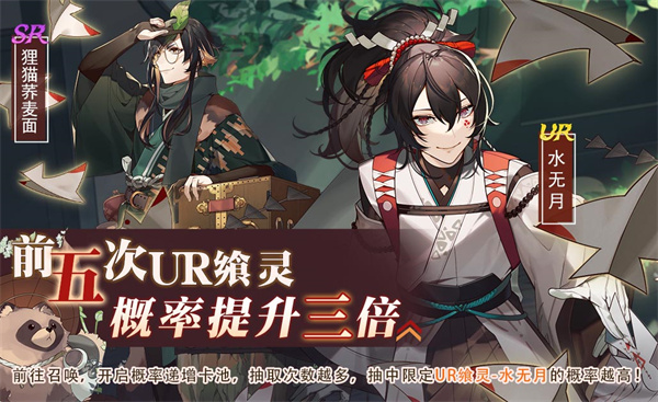 限时加入卡池,御侍大人使用专属道具进行召唤,该卡池UR飨灵抽取概率大幅度提升,并且随着抽取次数的增多,UR飨灵-水无月的抽取概率也会随之提升。