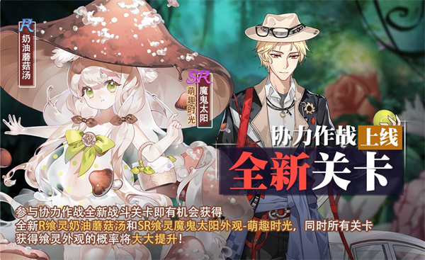 活动描述:活动更新后,协力作战新增挑战BOSS,御侍大人可在关卡中获得全新R飨灵-奶油蘑菇汤和SR飨灵魔鬼太阳外观-萌趣时光。同时活动期间内,所有关卡获得飨灵外观的概率将大大提升。
