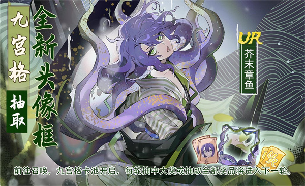 活动描述:活动期间,御侍大人参与抽卡可获取道具,使用道具参与九宫格可抽取全新头像框和UR级神器挑战券等豪华道具。