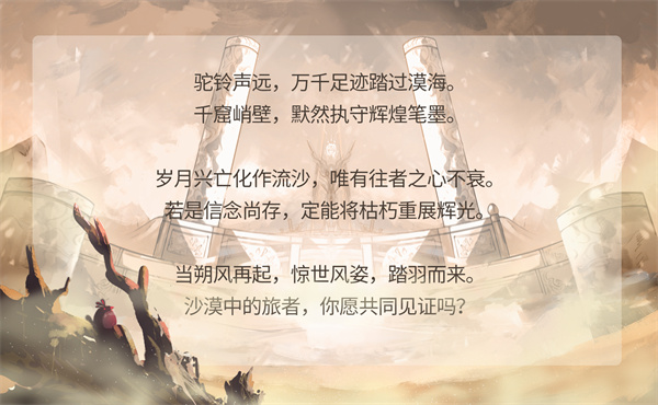 活动描述:万里朔漠连天晖,灼日金砂覆地茫。笙乐琅音,传颂远古歌谣。乱风尘烟,倾覆窟中之秘。千年凰羽再度现世,殒落或是涅槃,又将由谁书写黄沙之中的命运。