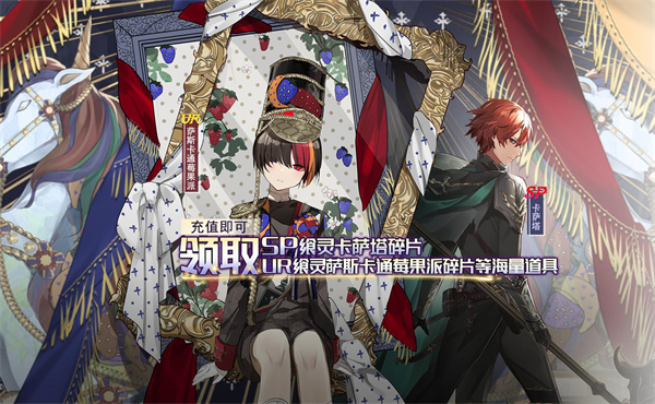 活动描述:活动期间,御侍大人累计充值一定数额即可在活动界面领取SP飨灵卡萨塔碎片、UR飨灵萨斯卡通莓果派碎片以及大量游戏内豪华道具。