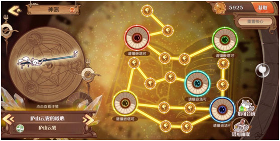 每个飨灵的神器核心,有多个节点组成,其中的大节点为“塔可”节点,不同颜色的塔可节点,代表着需要镶嵌对应属性的塔可。