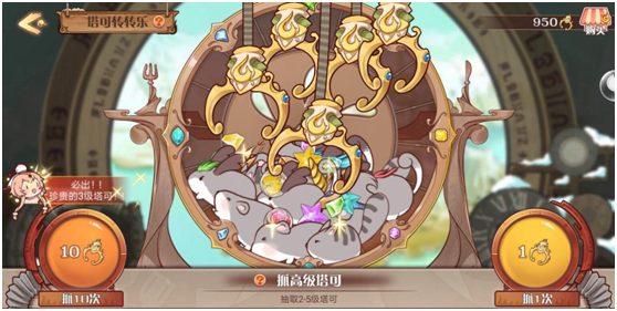 “塔可”可以通过塔可转转乐获得,十几只塔可小宝宝在转转乐中疯狂的奔跑,通过单抽或者十连抽即可抽取转转乐中的可爱的塔可~