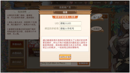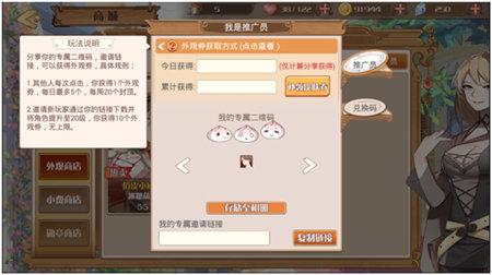 外观商店的皮肤只能通过“推广员”的形式获取,即每个玩家生成自己独立的二维码或邀请链接,分享至任意朋友圈、Q群等,其他人每点击一次即可获得1个外观券,每周20封顶,而被邀请的新玩家如果等级每提升20级,邀请者可额外获得10外观券,上不封顶,即参与升级的被邀请玩家越多,升的等级越高,邀请人获得的外观券量越大.